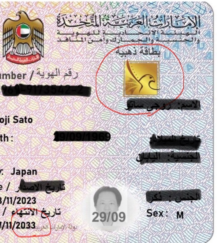 エミレーツIDは、日本におけるマイナンバーカードに類似するUAEにおける身分証の一種です。 UAEにおける銀行口座開設、保険証機能やドバイ携帯電話番号取得といった現地で生活するに欠かせないサービスを受ける上で必須の身分証となっており、UAEで生活をするにあたってはその取得が不可欠となります。有効期間は、日本の赴任者の様な民間企業のオフィス・ワーカーは2年、労働者は1年間、公務員は3年となっています。また投資家やUAEに貢献した者は、10年有効のゴールデン・ビザが申請できます。日本国パスポートを没収されたガーシーさんは、4億円の残高証明を投資資金として提出し取得した様です。ちなみに私は貧乏公務員でそんな大金はないので学者・研究者で取得しましたw 金バッチと10年の有効期間が特徴です。